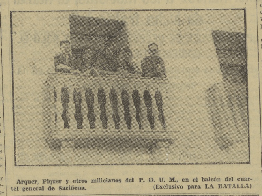 Arquer, Piquer y otros milicianos del POUM en el balcón del cuartel general de Sariñena ← Anterior Siguiente →