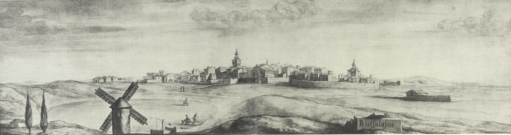 Bujaraloz (Burjalajos), acuarela de Pier Maria Baldi, Biblioteca Laurenciana de Florencia, recogida en Sánchez Rivero A, Mariutti de Sánchez Rivero A. «Viaje de Cosme de Médicis por España y Portugal (1668-1669)», Madrid: Sucesores de Rivadeneyra; 1933. 11 – 10 – 1668 Vista general. Silueta de las iglesias de Santiago el Mayor y la Merced y del palacio de Torres Solano, construidos poco antes de la visita principesca.
