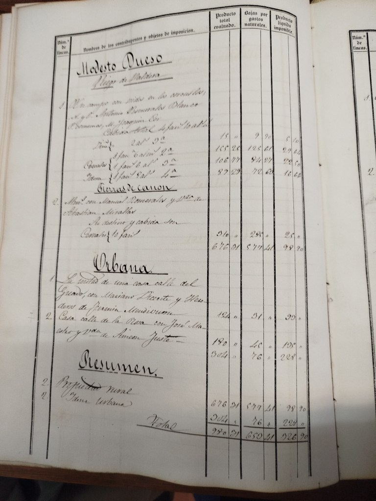 Aparece la partida de la “Huerteta” como “Un campo con vides en la Huerteta” y «Tierras de canon» que entendemos responden a tierras rústicas (o urbanas) que se arriendan, donde el «Canon» es el pago que el agricultor (arrendatario) hace al propietario (arrendador) por el uso de esas tierras para su explotación. Igualmente, una “valle” y “facera” llamada del corral (Mariano Altarraz) donde facera se refiere principalmente a un término tradicional aragonés para las tierras comunales (prados o estivas) en los límites entre términos municipales, sujetas a derechos de uso compartido por vecinos de ambos lados, y que generaron litigios históricos (derecho de alera o solera). También se citan comunes, como el curioso caso “Infanzonía y comunes” en el registro de Manuel López y tierras de Realengo, dicho de terrenos pertenecientes al estado: “otro en saso verde con realengo” (Campo de secano de Mariano Anoro Dueso).