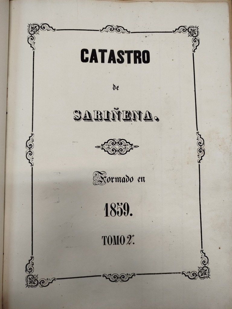 El catastro de 1859, sucesor del Catastro de Sariñena de 1830, lamentablemente solo nos llega el tomo II. Así, el libro aparece en cubierta de piel y letras doradas en el lomo con filigrana en oro. Consta de 400 páginas, tres de fondo al principio, una con el título impreso y una de fondo al final. El grueso responde a las diferentes entradas catastrales, páginas numeradas de la 284 a la 639. Cada entrada recoge el nombre de los contribuyentes y el objeto de imposiciones detallando en número de fincas, su producto total evaluado, bajas por gastos naturales y el producto liquido imponible.